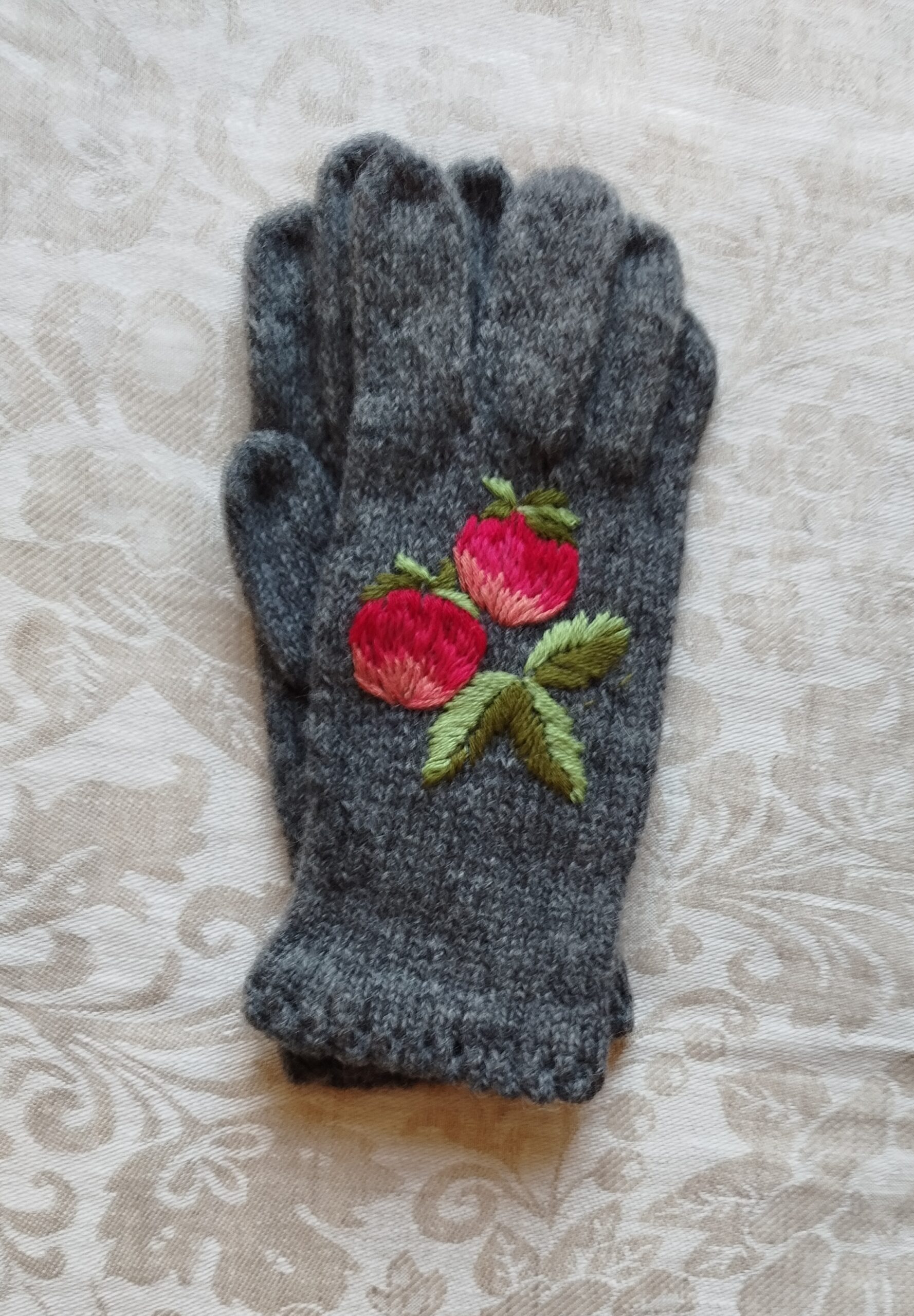 Kirjeldus: Käsikudumismasinal kootud ning käsitsi tikitud sõrmikud