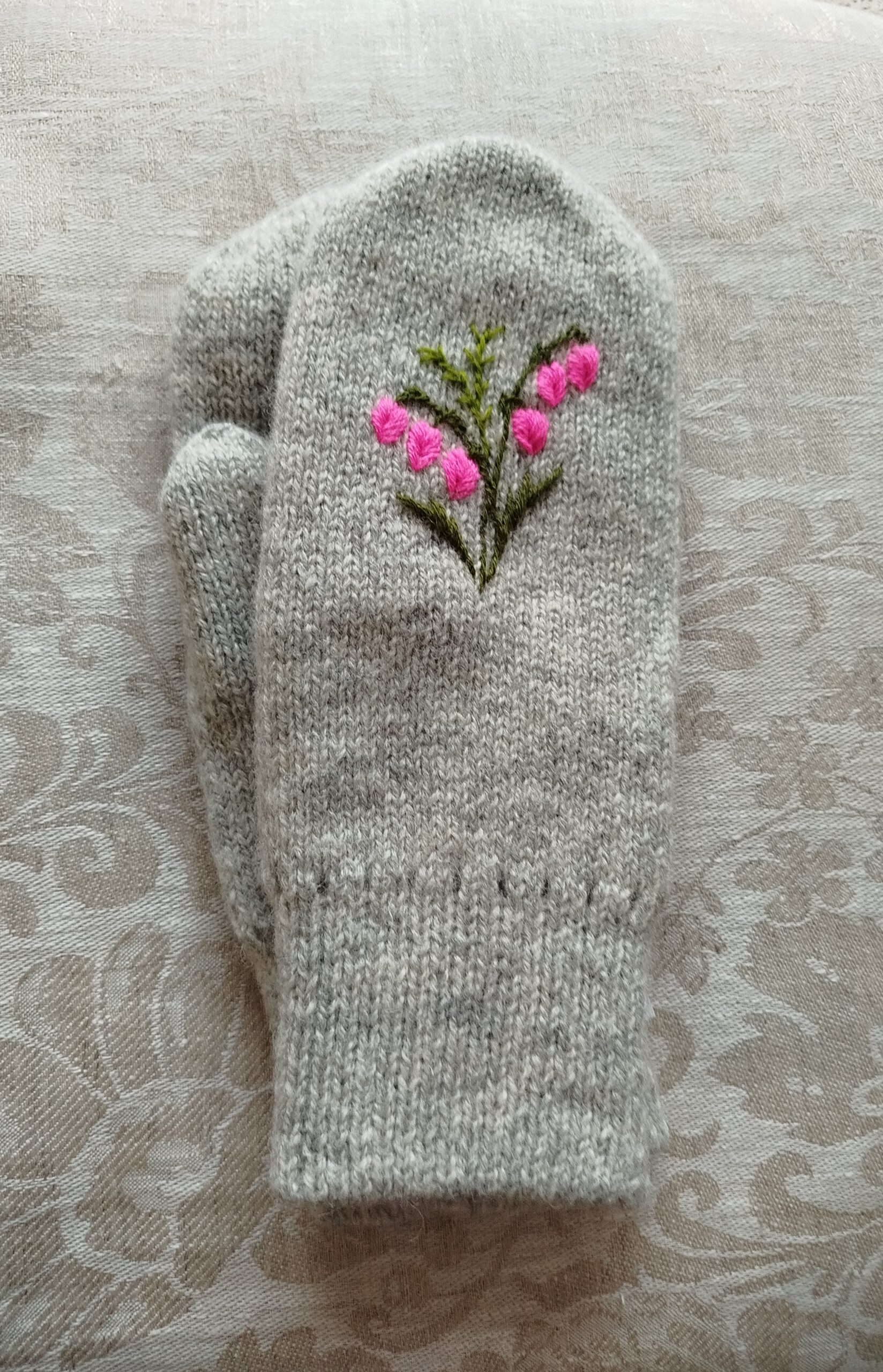 Kirjeldus: Käsikudumismasinal kootud ning käsitsi tikitud topeltlabakindad