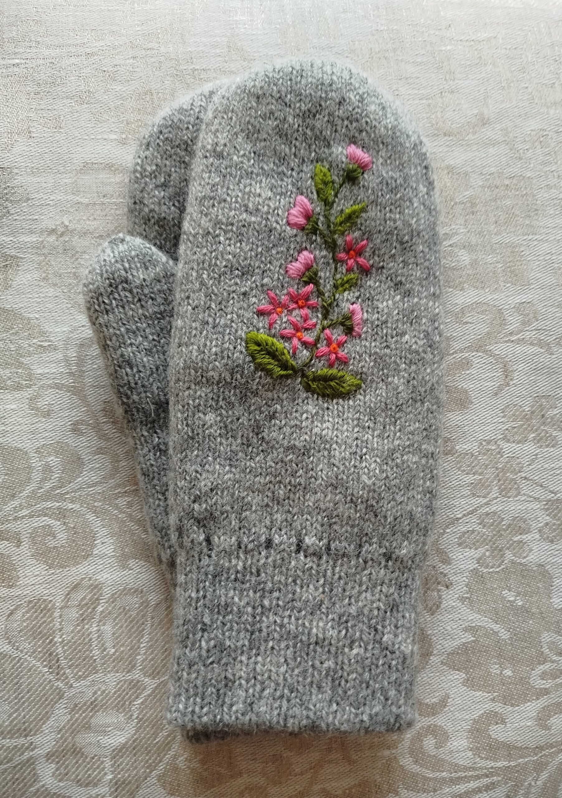 Kirjeldus: Käsikudumismasinal kootud ning käsitsi tikitud topeltlabakindad